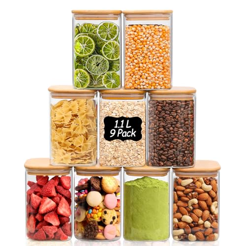 ComSaf 1.1L Storage Jars with Lids Set of 9, Glass Food Storage Containers for Kitchen, Clear Square Glass Jar with Bamboo Lids, Pantry Organizers and Storage for Flour Oat Pasta Tea Coffee Bean