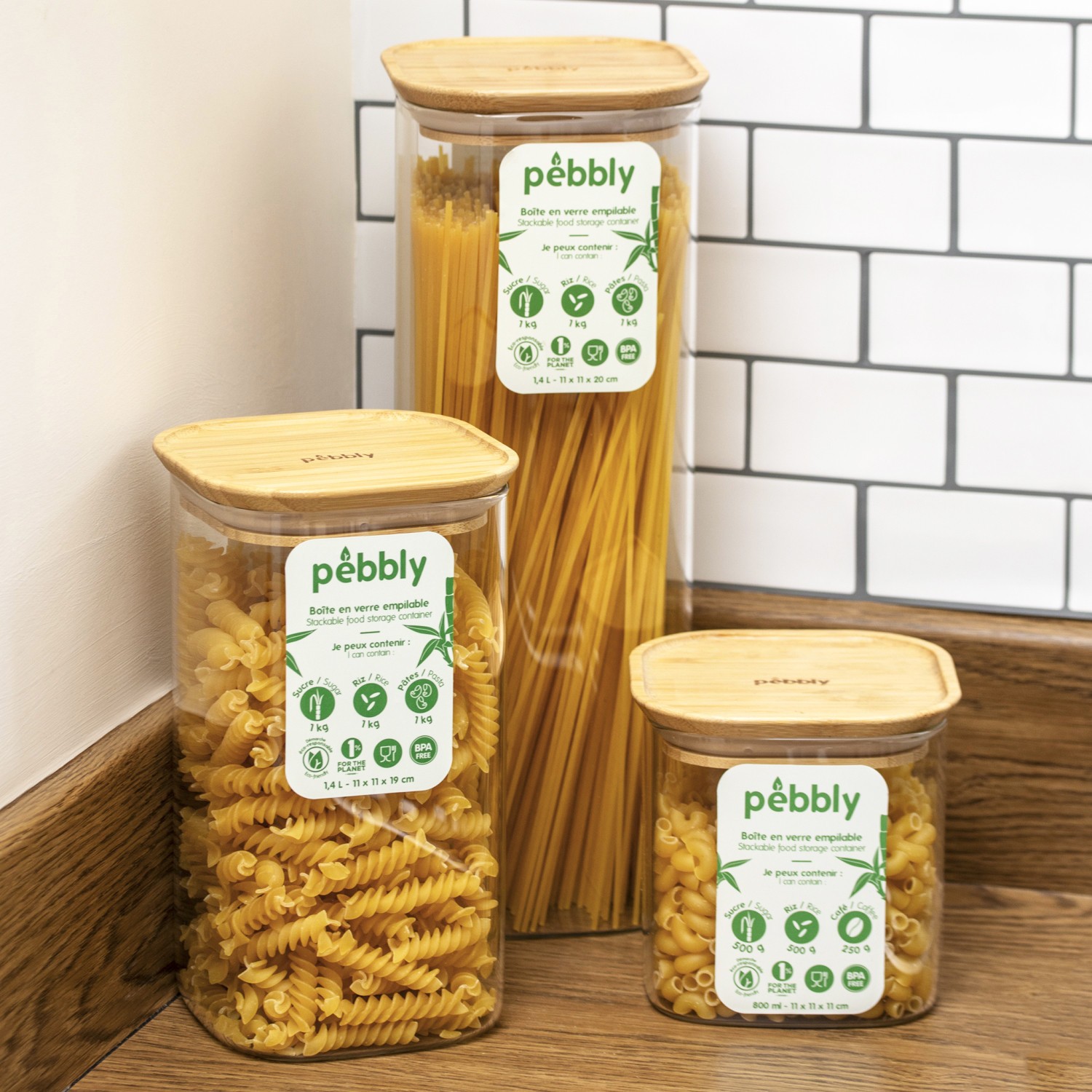 Set of 3 Pebbly Bamboo Lid Glass Jars Eco Kitchen Food Rice Pasta Storage Pots