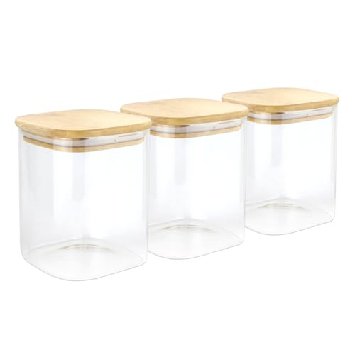 PRICE BEATER Glass Storage Jars with Bamboo Lids 900 ML Set of 3, Airtight High Borosilicate Food Canisters for Kitchen, Clear Containers for Cereal, Pasta, Coffee, Tea, Sugar, Dishwasher Safe