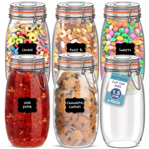 HEFTMAN Clip Top Glass Jars Set of 6-1.5L Airtight Glass Jars with Lids & Silicone Seal for Pasta, Sourdough Starter, Chutney, Pickling, Kitchen Organisation - Empty Food Storage Jar Set (6 Pack)