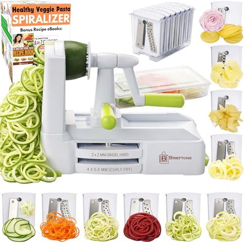 Brieftons 7-Blade Vegetable Spiralizer: Strongest-Heaviest Spiral Slicer, Best Veggie Pasta Spaghetti Maker for Low Carb/Paleo/Gluten-Free Meals, with Blade Caddy, Container, Lid & 4 Recipe Ebooks