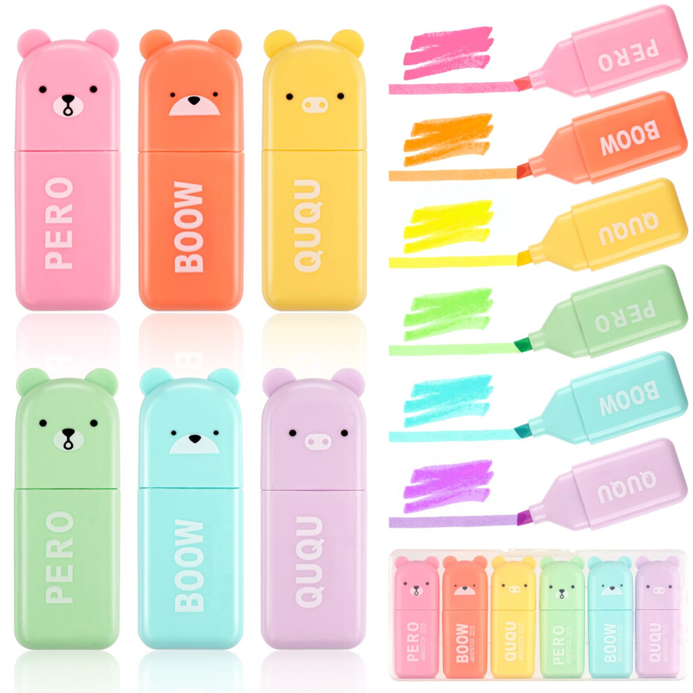 Pack of 12 Mini Highlighters, Cartoon Bear Shaped Pastel Highlighter Pens Set for Kids and Adults, 6 Fun Styles