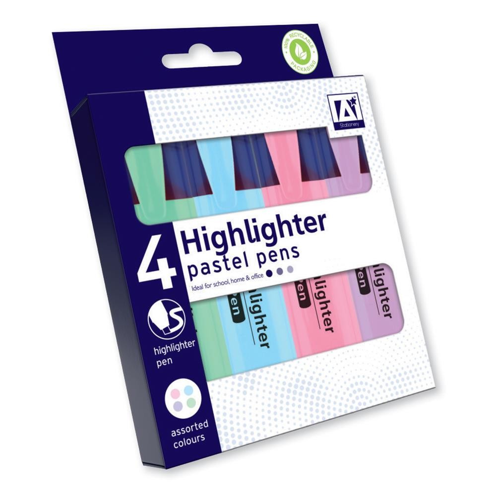 Pastel Highlighter Pens - 4 Pack Colour Pink Purple Blue Green Assorted School