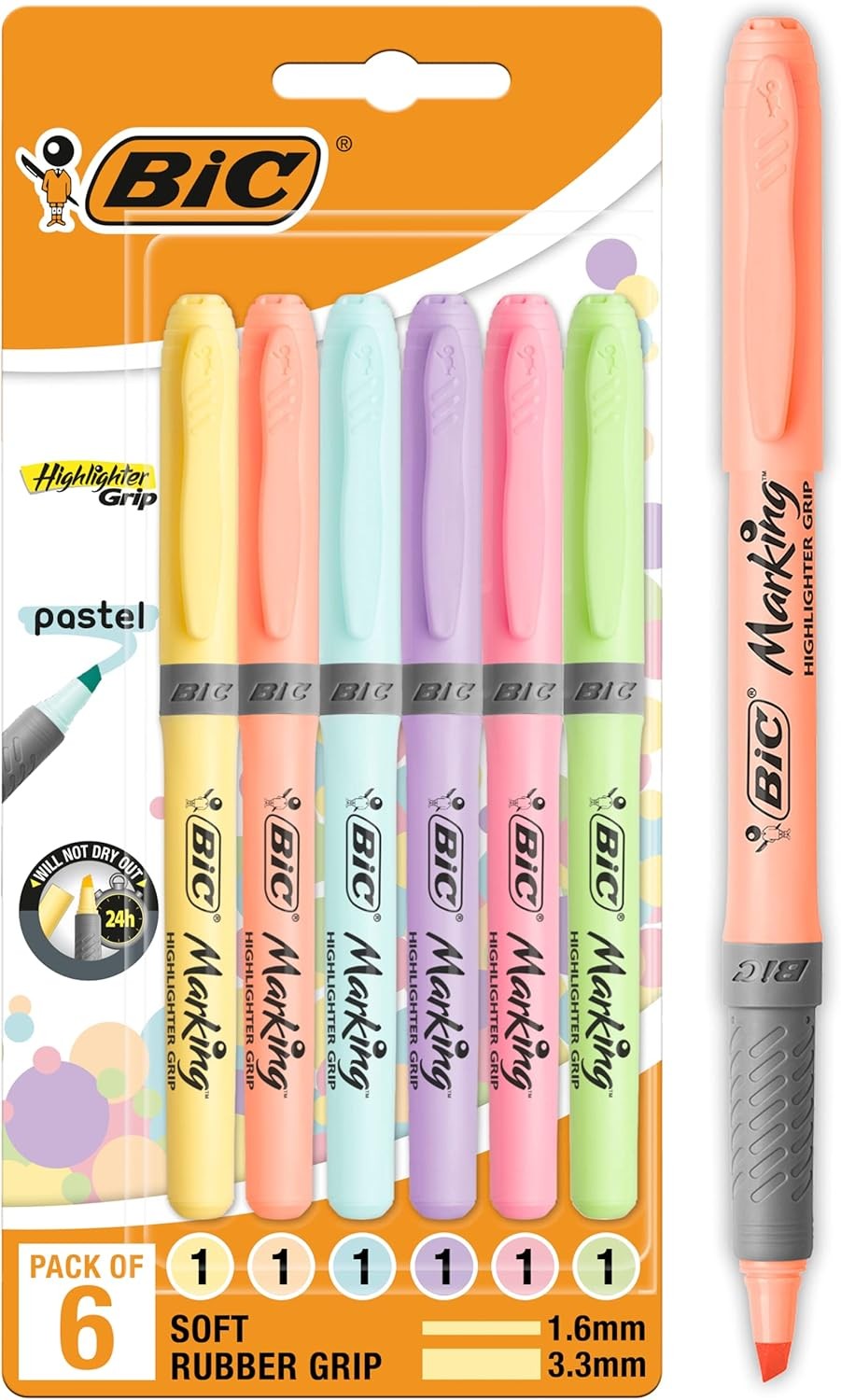 BIC Highlighters Pastel Colours - Grip Highlighter Pens Multipack - Stationery Supplies Pack of 24