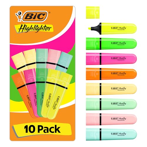 BIC Marking Flat Highlighter Pens with Modular Chiselled Nib (1.2 mm-4.6 mm) - Assorted Neon and Pastel Colours, Pack of 10