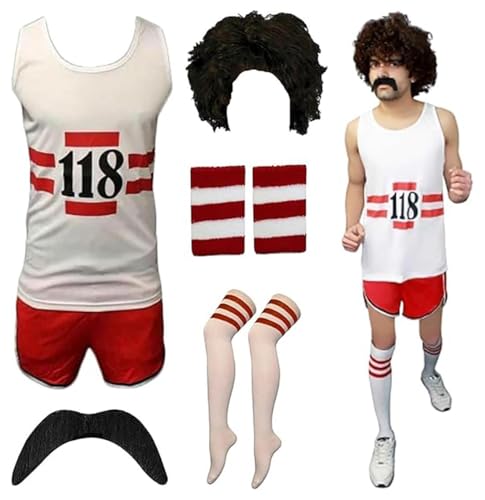 RIDDLED WITH STYLE Unisex 118 Fancy Dress Costume for Men & Women Retro Marathon Outfit with Vest, Shorts, Wig, Tash, Socks Fun Run, Stag Do, Party Wear Size UK Small - X-Large