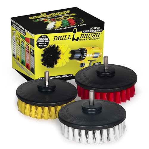 Cleaning Supplies - Drill Brush - 3 Brush Kit - White Soft for Leather, Glass, Carpet - Yellow Medium for Bathroom Surfaces: Bathtub, Shower, Sink, Flooring - Red Stiff for Outdoor Deck, Patio