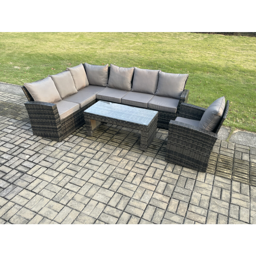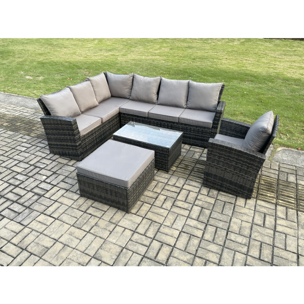 Fimous 7 Seater Rattan Garden Furniture Corner Sofa Set Outdoor Patio Sofa Chair Table Set with Rectangular Coffee Table Dark Grey Mixed