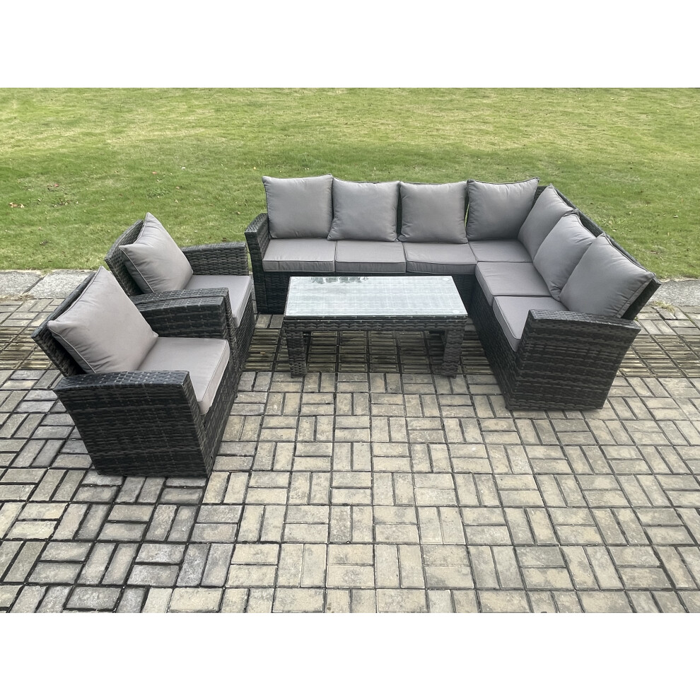 Fimous 8 Seater Rattan Garden Furniture Corner Sofa Set Outdoor Patio Sofa Chair Table Set with Rectangular Coffee Table Dark Grey Mixed