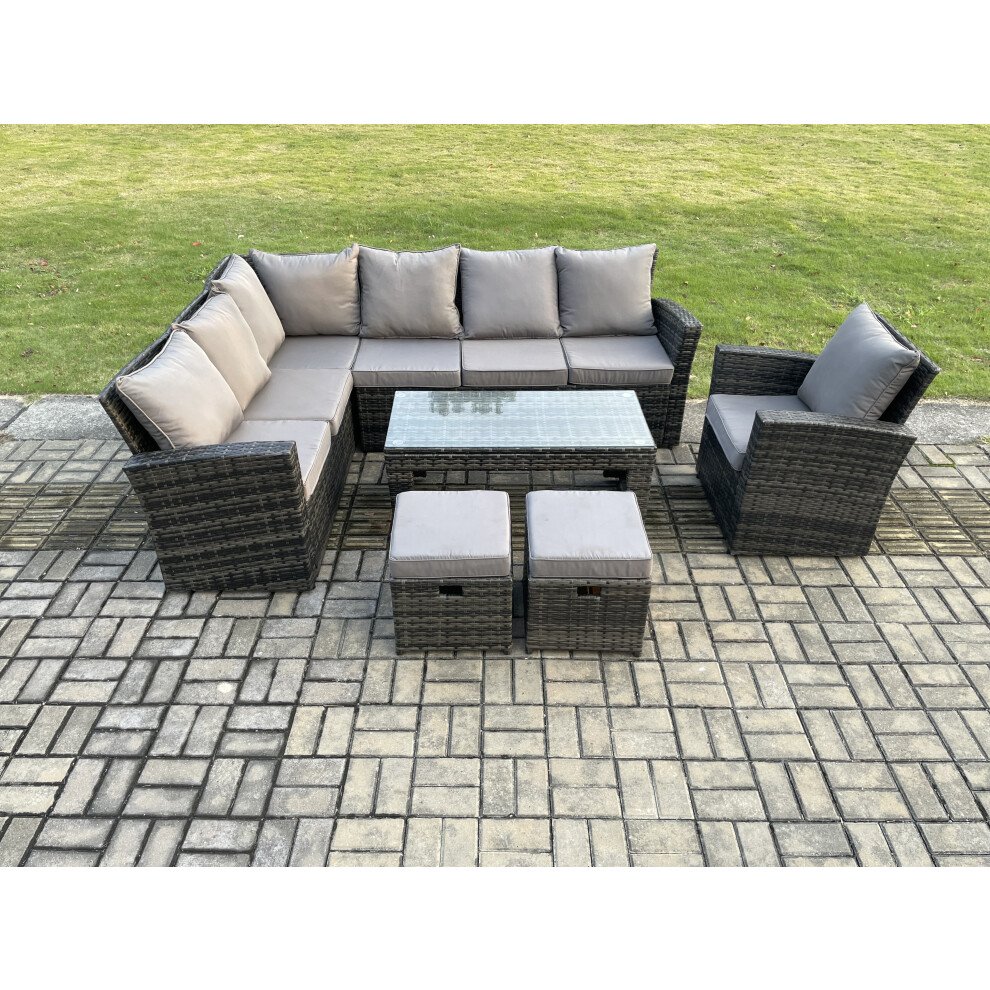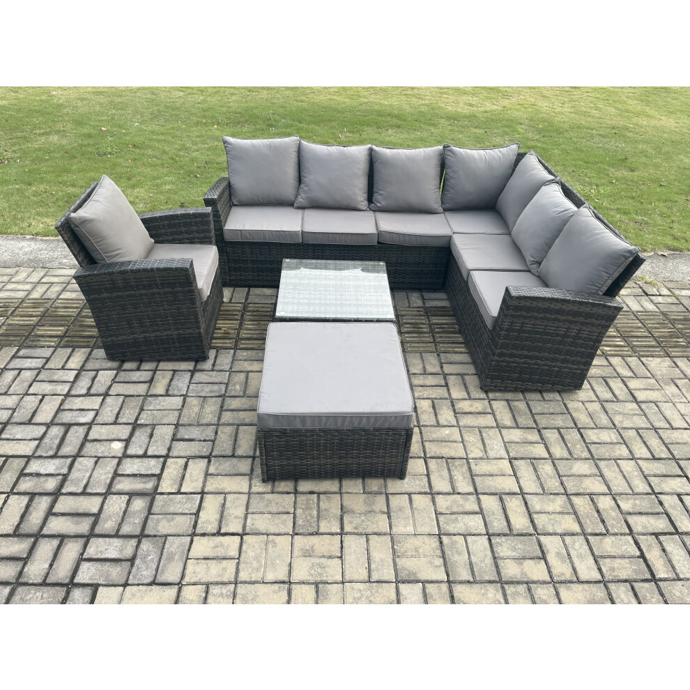 Fimous 8 Seat Rattan Garden Furniture Corner Sofa Set Outdoor Patio Sofa Chair Table Set with Big Footstool Dark Grey Mixed