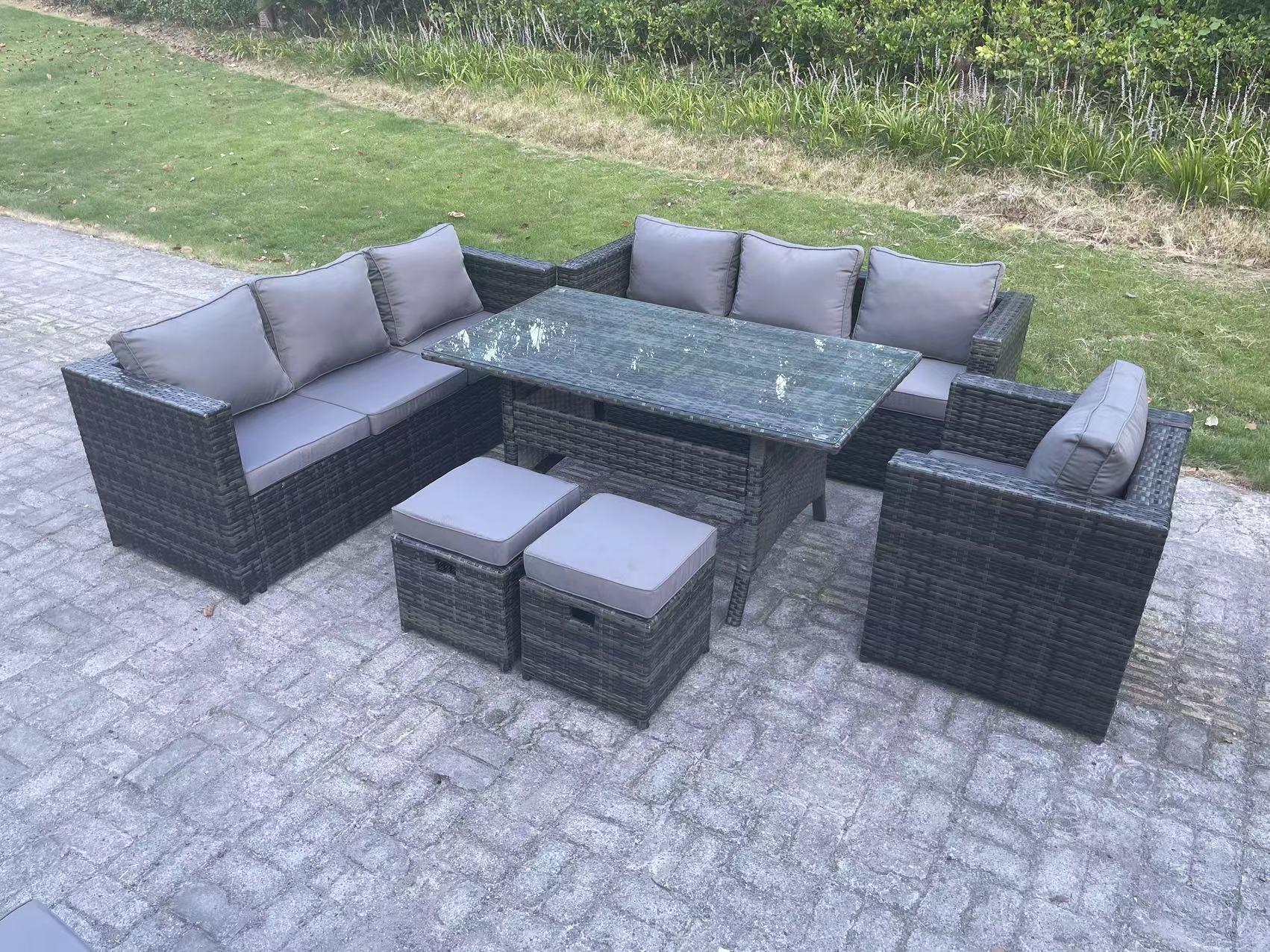 Lounge Sofa Garden Furniture Set Rattan Rectangular Dining Table Patio Chair with 2 Small Footstool 9 Seater