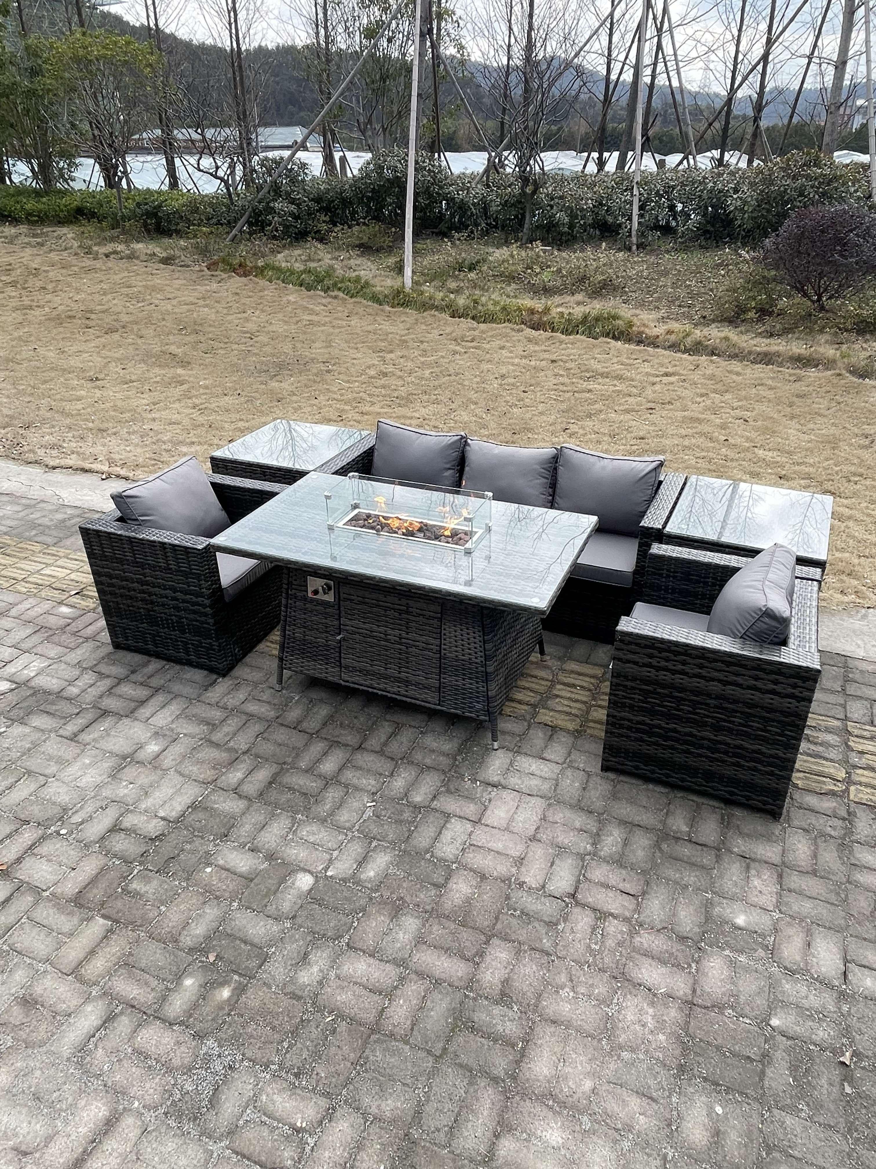 Outdoor Lounge Rattan Sofa Set Garden Furniture Gas Firepit Set Dining Table Patio Heater 2 Chair 2 Coffee Table
