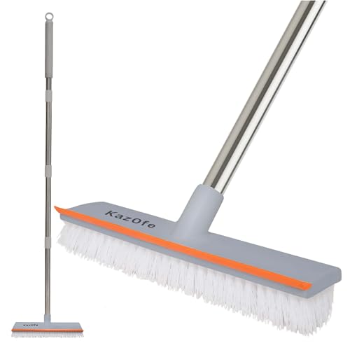 KazOfe 2-in-1 Floor Scrubbing Brush with Squeegee/Handle, Bathroom Floor Cleaning Scrubber, Long Handled Scrubbing Brush Hard Bristle for Deep Cleaning Kitchen, Deck, Tile, Patio (Grey)
