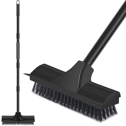 2 in 1 Floor Scrub Brush with Long Handle, Scrape and Brush Stiff Bristle Shower Cleaning Sweeping Deck Push Broom Brush for Kitchen, Bathroom, Patio, Wall and Deck (Black)