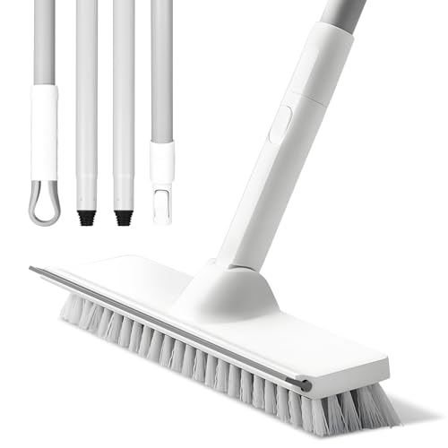 ASelected Floor Scrubbing Brush with Adjustable Long Handle - Stiff Bristle Brush with Squeegee for Cleaning Bathroom, Shower, Patio, Garage, Pool, White