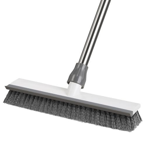 Floor Scrubbing Brush, 2 in 1 Floor Cleaning Brush with Squeegee, Long Handle Stiff Bristle Scrub Brushes for Cleaning Bathroom Tile Patio Deck