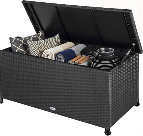 CASARIA® 270 Litre Polyrattan Garden Storage Box with Wheels | Waterproof UV Resistant | Inner Lining | 117x53x60cm Patio Furniture Cushion Chest with Gas Pressure Lift Lid | Black