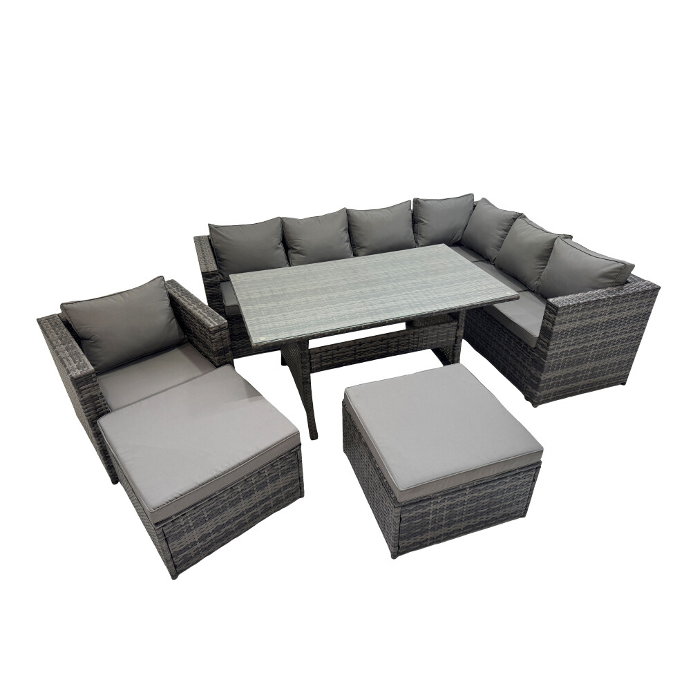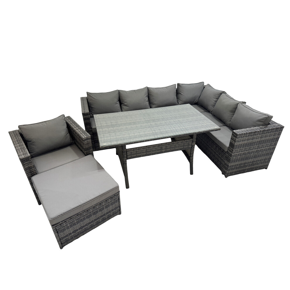 Fimous 7 Seater Rattan Garden Furniture Set Outdoor Patio Dining Corner Sofa Sets with Dining Table Big Footstool Light Grey Mixed