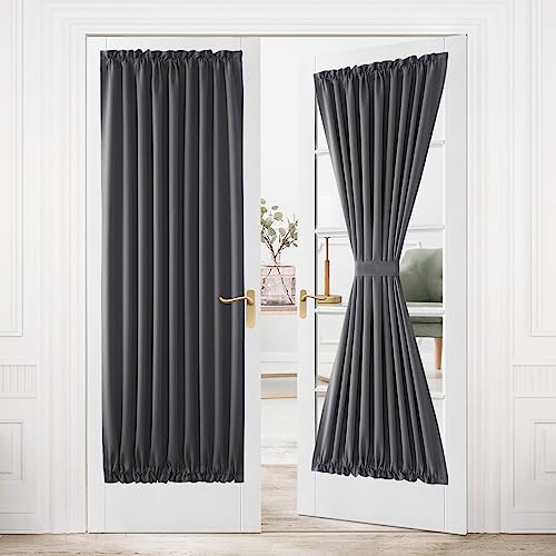 DWCN French Door Curtains – Rod Pocket Thermal Blackout Curtain for Doors with Glass Window, Kitchen and Patio Doors for Privacy, 36 X 80 Inches Long, 1 Curtain Panel with Tieback, Dark Grey