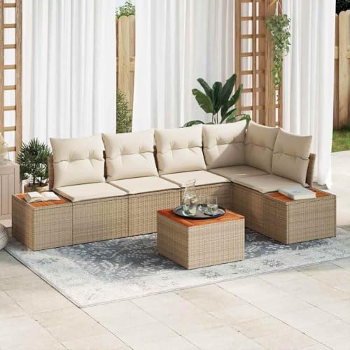Yunovire 6-TLG Garden Sofa Beige Poly Rattan Acacia, Modular Outdoor Patio Furniture Set with Cushion, Storage Space for Balcony, Terrace and Garden