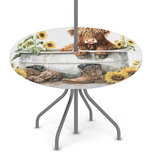 Tablerazzi Round Outdoor Tablecloth with Umbrella Hole and Zipper Vintage Highland Cow Bath and Sunflower Fitted Tablecloth Wipeable Table Cloth Round Patio Table Cover for Picnic, 36''-44''