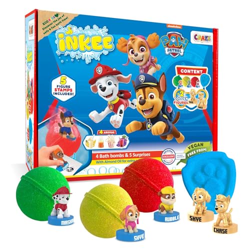INKEE Paw Patrol Gift Box: 4 Kids Bath Bombs with Almond Oil & 5 Surprise Paw Patrol Figures