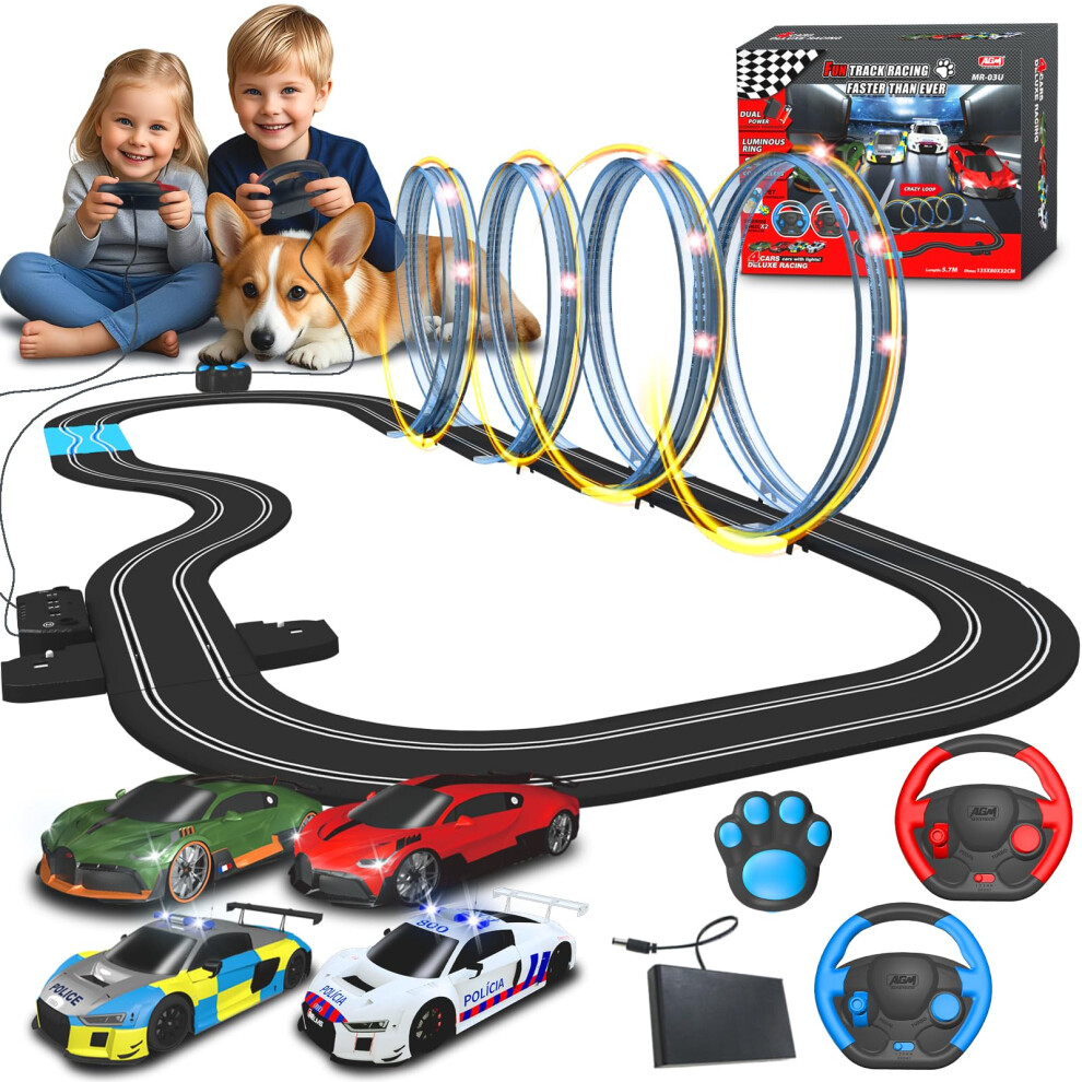 AGM MASTECH 18.7ft Slot Car Race Track Set,4 Official Licensed Light-Up Cars, Steering Wheel&Paw Co