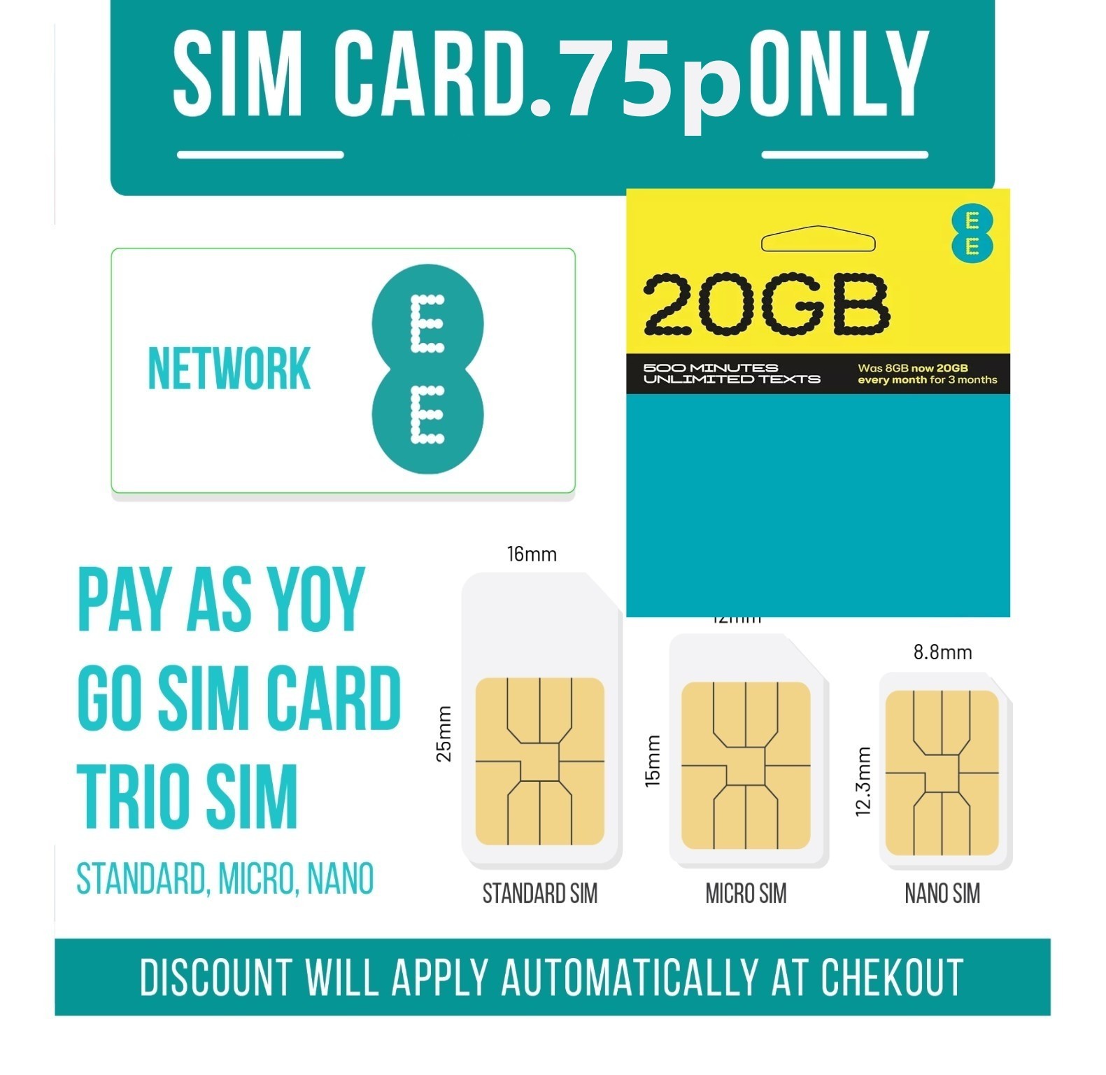 EE £10/30 days for 100 Mins, Ultd Texts & 2GB data. Pay as you go PAYG Multi Sim Trio simcard. Standard/Micro/Nano Size.