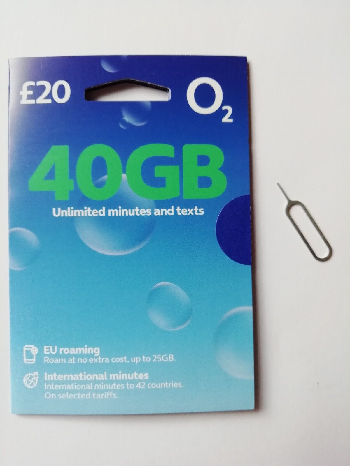 O2 PAYG Sim Card International 40GB for £20 + SIM EJECTOR PIN *NB* ZERO CREDIT