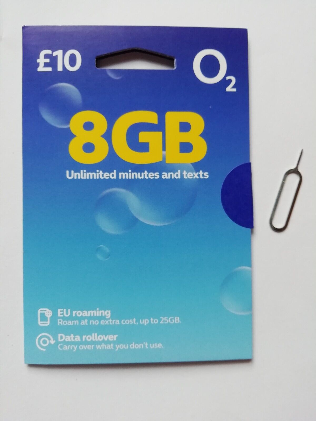 O2 PAYG Sim Card Unltd std UK mins txts 8GB for £10 + SIM EJECTOR PIN NO CREDIT