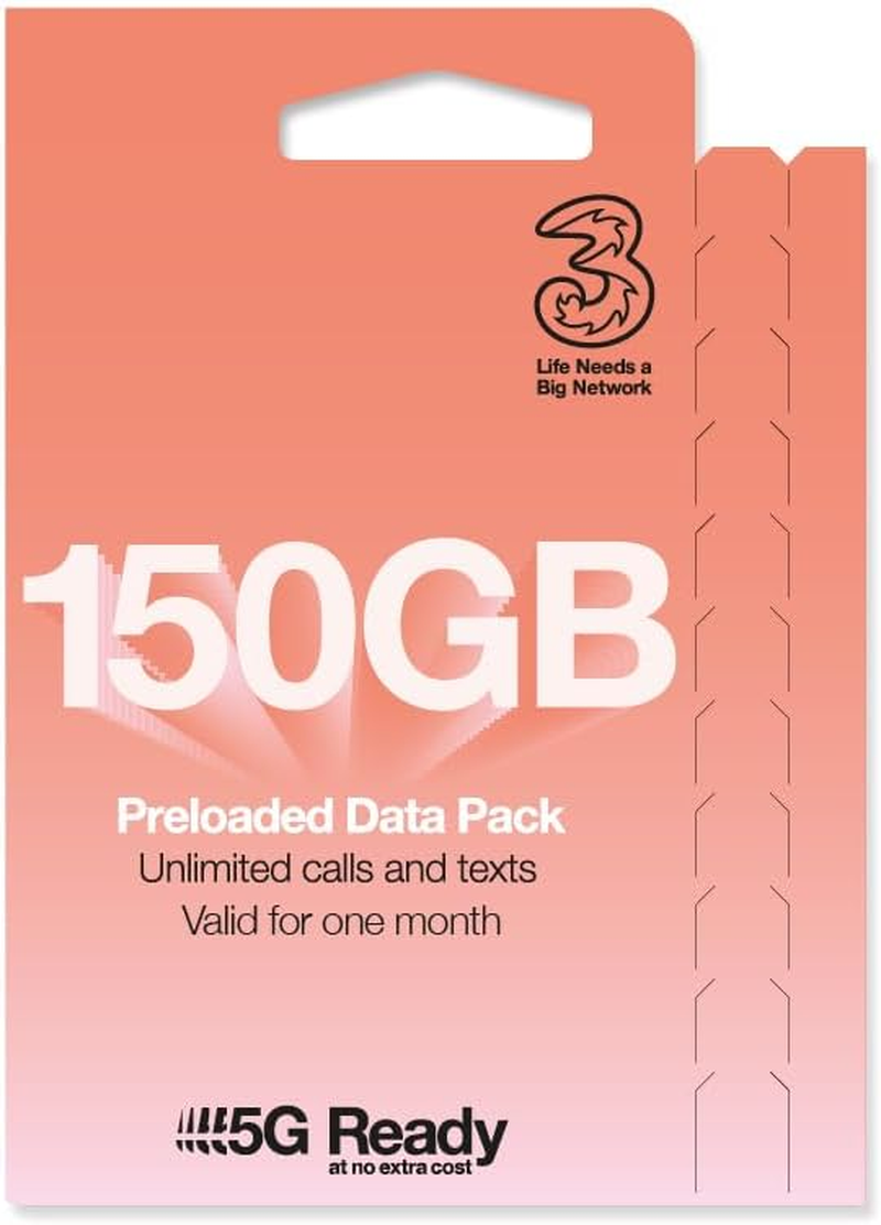 Three Mobile PAYG Voice SIM Pack, Pre-Loaded with 150GB of Data, Unlimited Minut