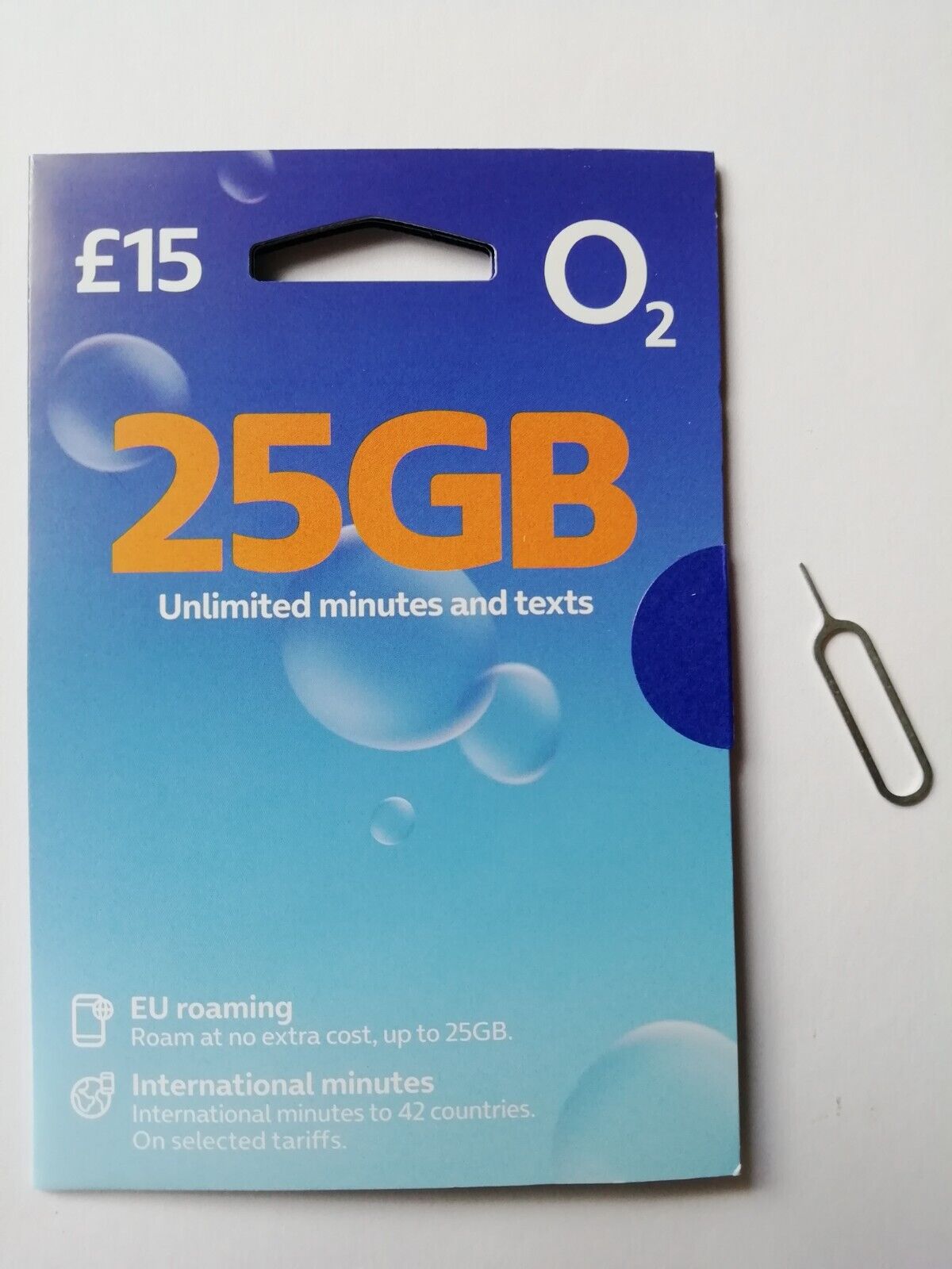 O2 PAYG Sim Card Unltd std UK mins txts 25GB for £15 + SIM EJECTOR PIN NO CREDIT