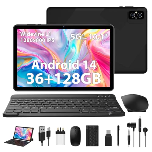 AXETOP 10 inch Tablet PC Android 14, 36GB RAM+128GB ROM (1TB TF), Quad-Core Processor, 5G WiFi丨BT 5.0丨8000mAh丨8MP+5MP丨Widevine L1, Tablet with Keyboard, Mouse, Case, Stylus, Earphones - Black