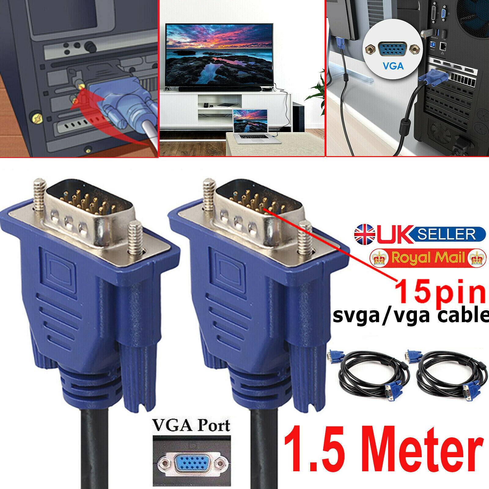 15 Pin Extension VGA SVGA 1.5M Male to Male Cable Lead PC Monitor TFT TV LCD UK