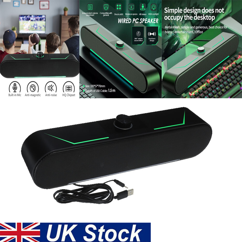 Wired PC LED USB Sound Bar Stereo Speakers TV Computer For PC Desktop Tablets UK