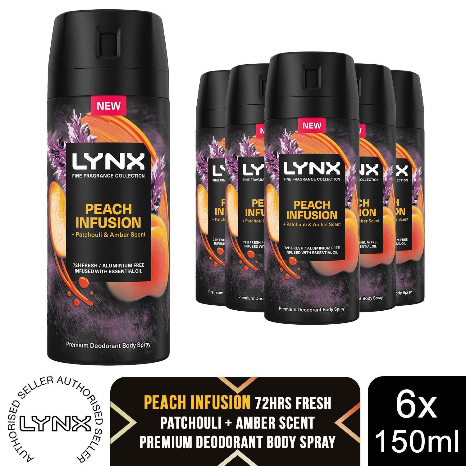 Lynx Body Spray Fine Fragrance Collection Peach Infusion for Men 150ml, 6 Pack