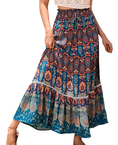 Genfien Women Skirts Elastic High Waist Maxi Skirts for Women 2 in 1 Vintage Maxi Skirt Summer Long Dresses Elegant A-Line Beach Skirt Peacock Blue