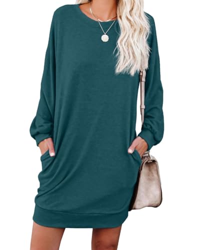 PrinStory Women Jumper Dress Long Sleeve Casual Loose Mini Winter Dresses Knitted Pullover Tunic Tops with Pockets UK Size 10-12 (Peacock Blue, M)