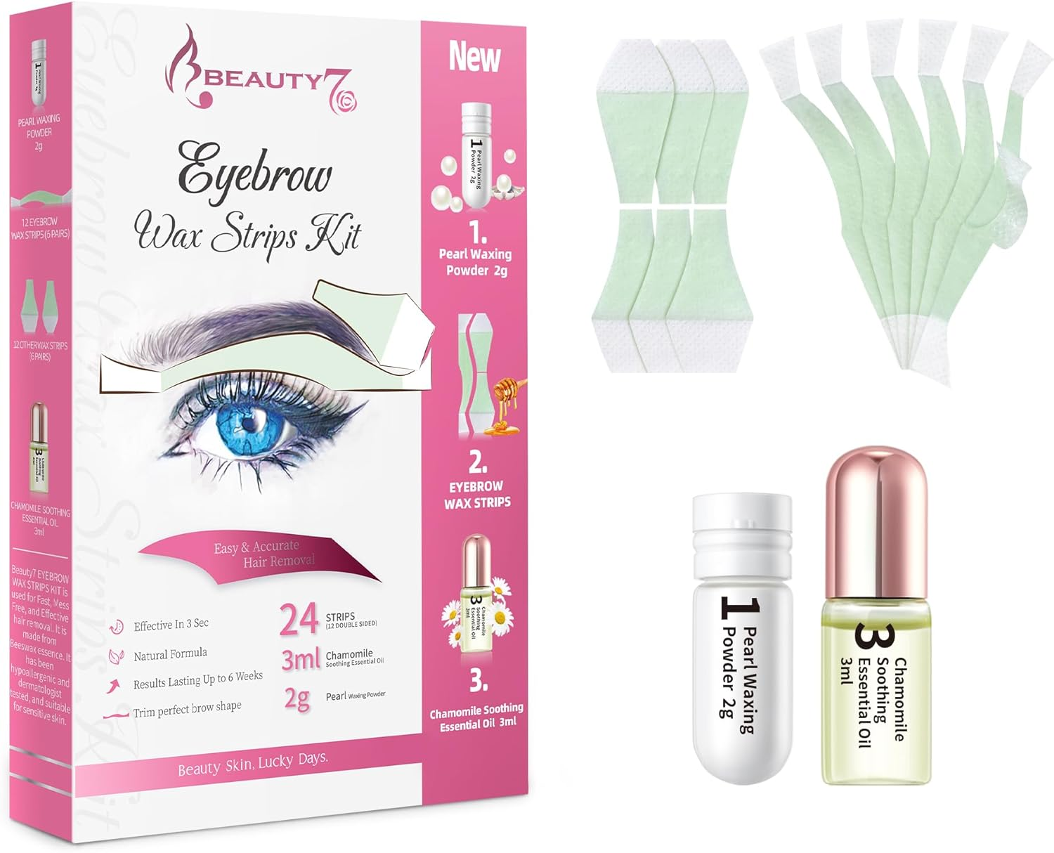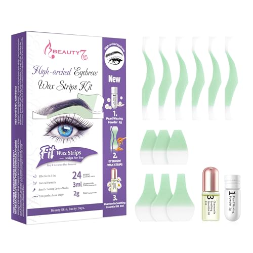 Beauty7 Eyebrow Waxing Strips, High-arched Form Eyebrow Strips Pre-cut for Face, Quick Hair Removal Facial with 24 Waxing Strips + 3ml Soothing Oil After Wax, 2g Pearl Powder