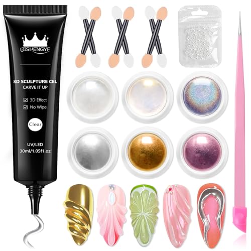 BISHENGYF 3d Nail Gel: 30g No Wipe Clear 3d sculpting nail gel and Mirror Effect Rose Gold chrome nail powder,6Pcs Glassy Yellow Aurora pearl chrome nail powder,5D Carving for Nail Art(Silver/Laser)