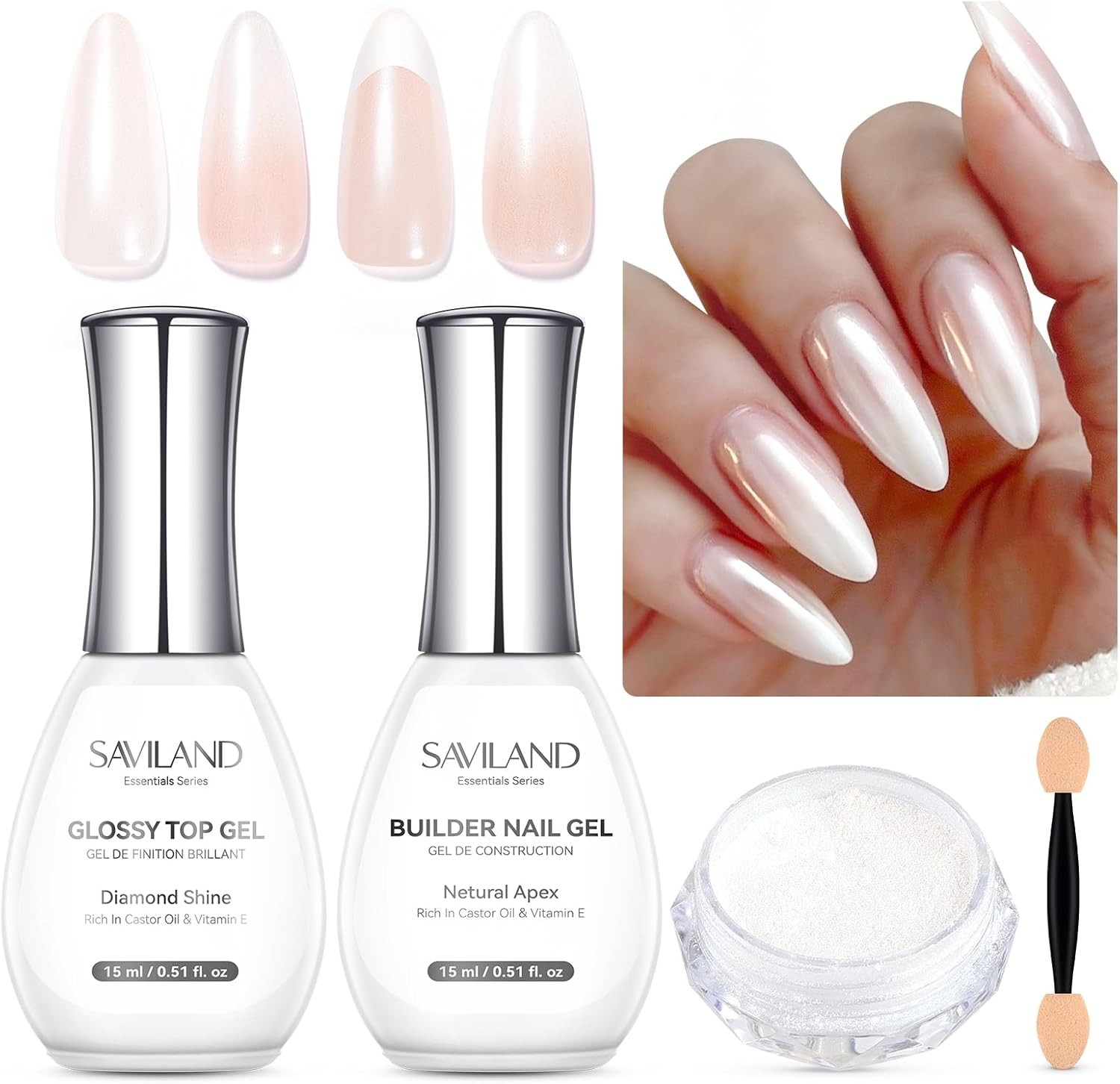 SAVILAND Essentials Chrome Nail Powder Set: Pearl Powder & Milky White Builder