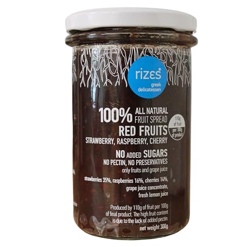 Rizes Greek Delicatessen 100% Natural Red Fruits Spread – Strawberry, Raspberry & Cherry – No Added Sugar, No Pectin, No Preservatives – Vegan & Handmade Greek Fruit Preserve 300g