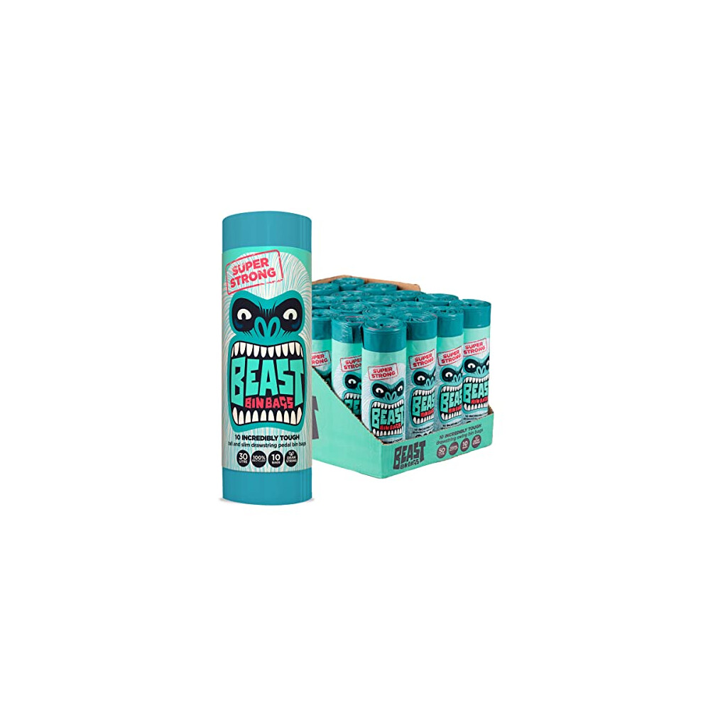 BEAST BIN BAGS, 10 Rolls of 10 x 30 Litre Bags (Total 100 Bags) - Made From 100% Recycled LLDPE - Incredibly Strong, Tall and Slim Drawstring Pedal Blue Bin Bags