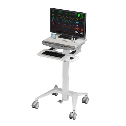 ProperAV Mobile Workstation Trolley Cart, Height Adjustable with Foot Pedal, Lockable Wheels, Folding Keyboard Trays for Hospitals, Warehouses, Schools, Airports, Train Stations & more