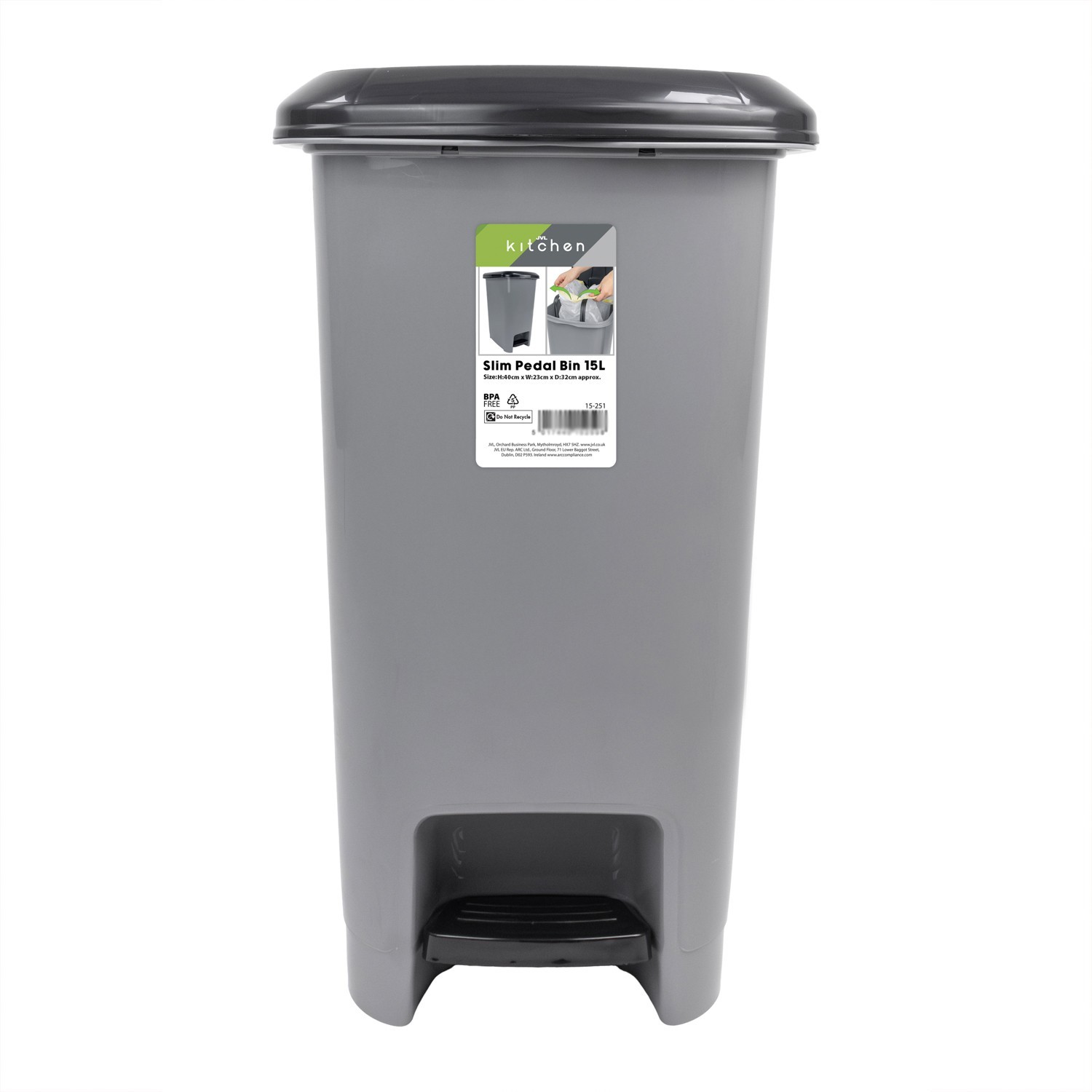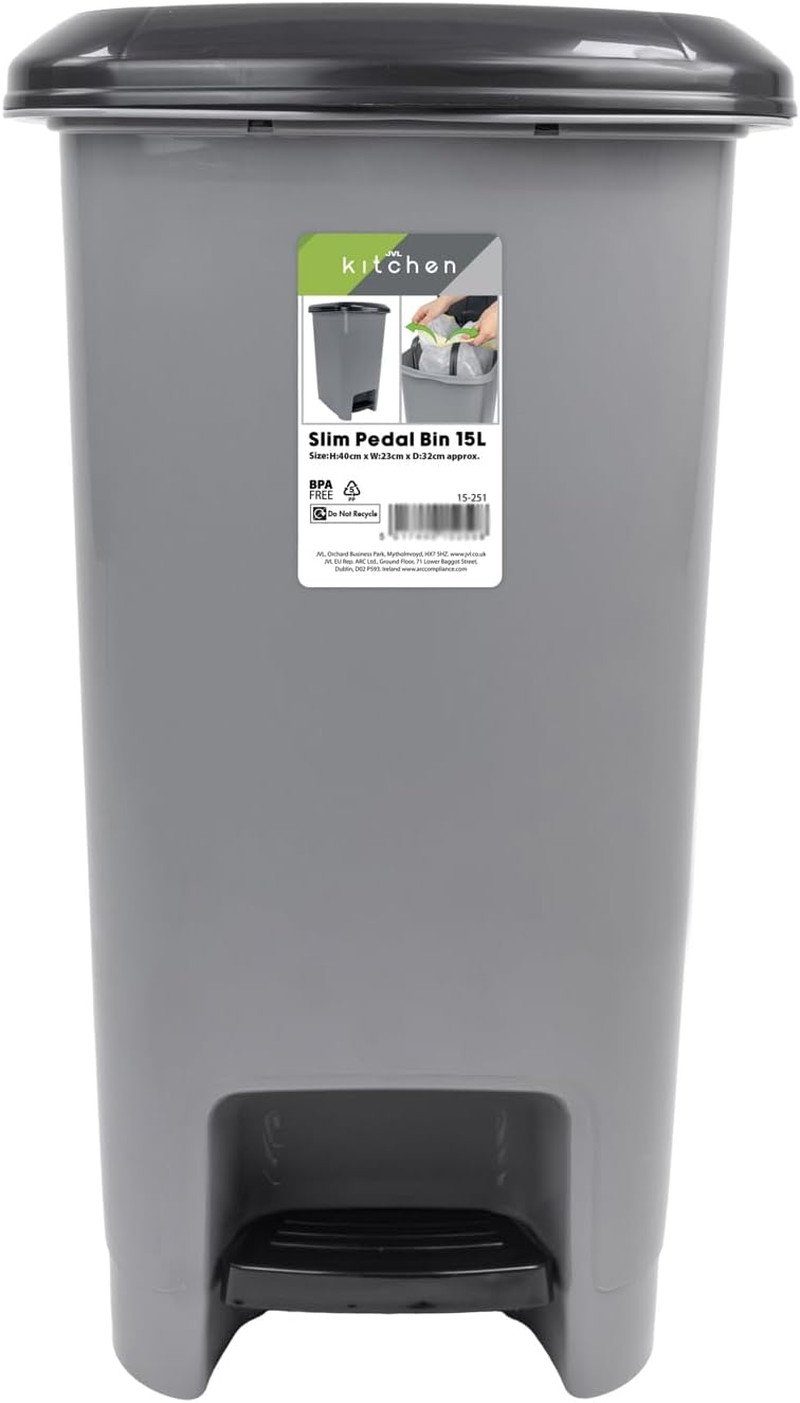 JVL Slim Plastic Lidded Foot Pedal Waste Bin, 15L, Grey