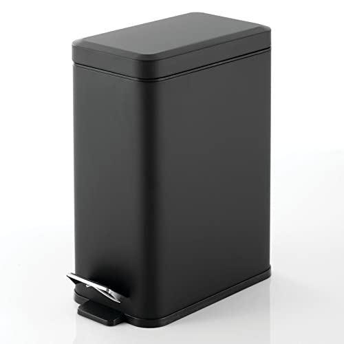 mDesign Pedal Bin — Waste Bin with Pedal, Lid and Plastic Bucket Insert for Bathroom, Kitchen, and Office — Metal Household Rubbish Bin with Ergonomic Design — Black