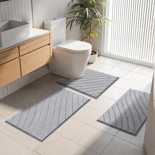 SHACOS Soft Bathroom Mat Sets 3 Piece Non Slip Absorbent Bath Mat Set Toilet Mats Machine Washable Bathroom Rug Pedestal Mats for Toilet, Light Grey, 40x60cm+50x80cm+U50x60cm