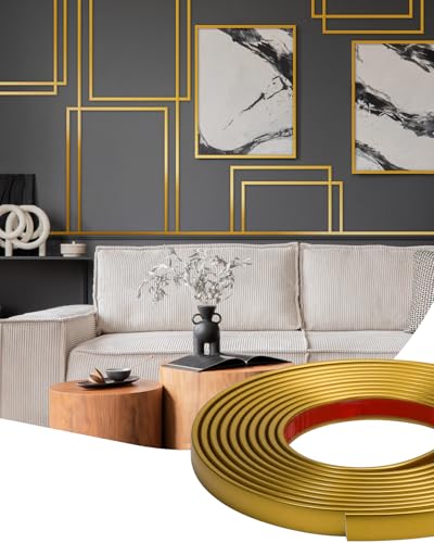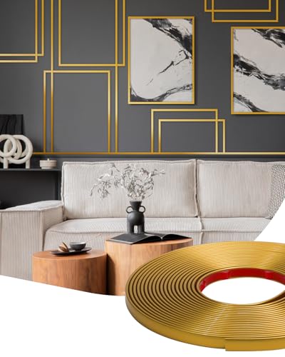 Lpraer 10M Stainless Steel Wall Molding Trim, Peel and Stick Wall Moulding, Metal Trim Flexible for TV Background Wall Ceiling Floor Cabinet Tile Mirror Edge Self-Adhesive DIY Moulding,10mm Gold