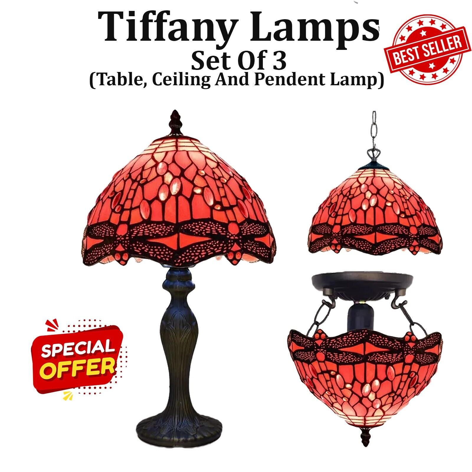 Vintage Tiffany Table Ceiling Pendant Lamp Set Of 3 Dragonfly Stained Glass Uk