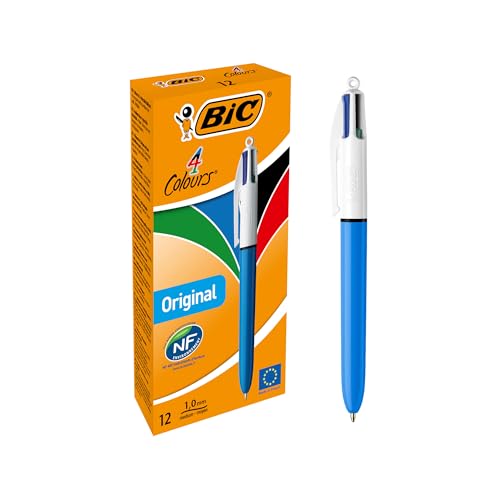 BIC 4 Colours Original Pens, Multi Coloured Pens All In One, Retractable Ballpoint Biro Pens, Green, Blue, Red, Black, 12 Pens Per Pack, 1 Pack
